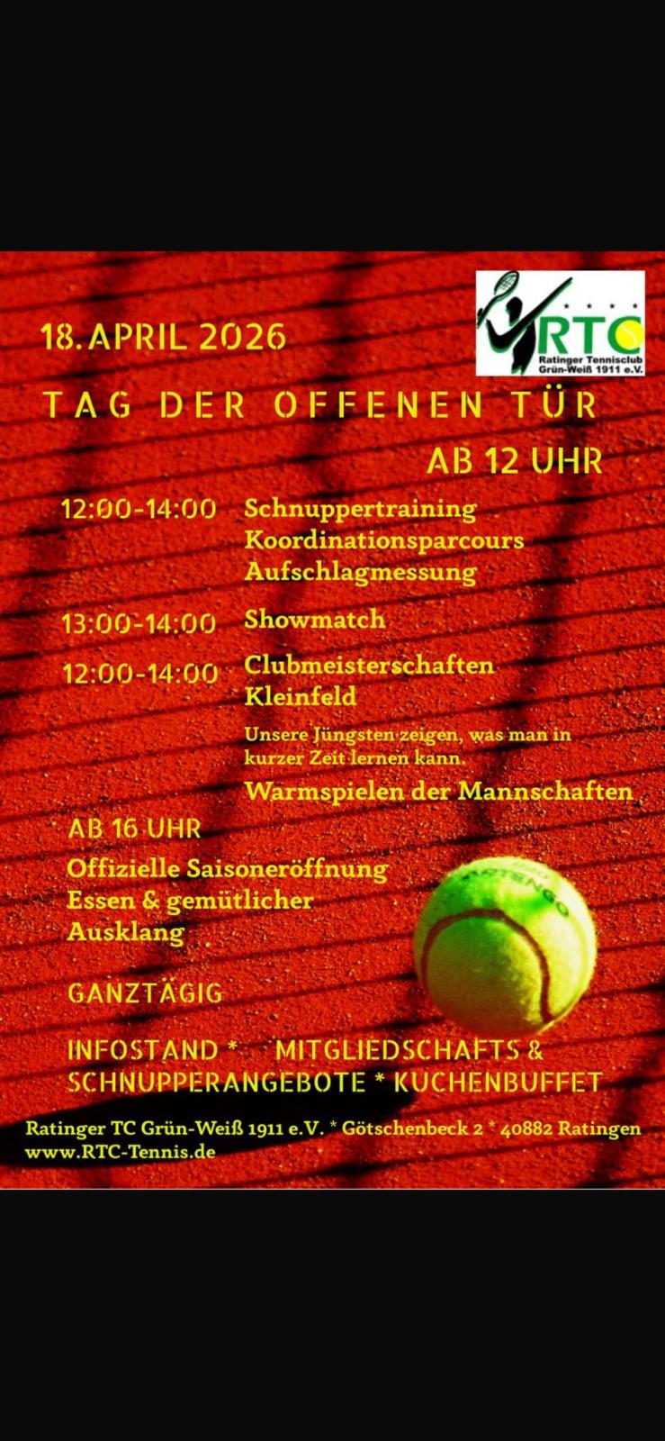 12:00-14:00 Schnuppertraining, Koordinationsparcours, Aufschlagmessung 13:00-14:00 Showmatch 14:00-16:00 Clubmeisterschaften Kleinfeld, Warmspielen der Mannschaften (ab) 16:00 Offizielle Saisoneröffnung mit Essen & gemütlichem Ausklang