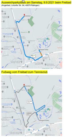 Da wir viele Zuschauer erwarten, solltet Ihr zur Anfahrt und zum Parken auch die Ausweichparkplätze am Ratinger Schwimmbad in Anspruch nehmen: