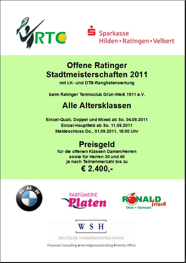 Offene Ratinger Stadtmeisterschaften 2011mit DTB-Ranglistenwertung und LK-Wertung Aktive (H/D, H30/D30) bei tvpro-online.de Senioren (ab H/D40) bei tvpro-online.de